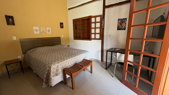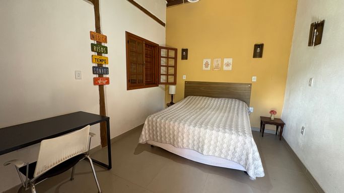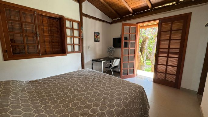 No segundo pavimento, há um dormitório aconchegante com varanda.