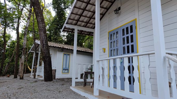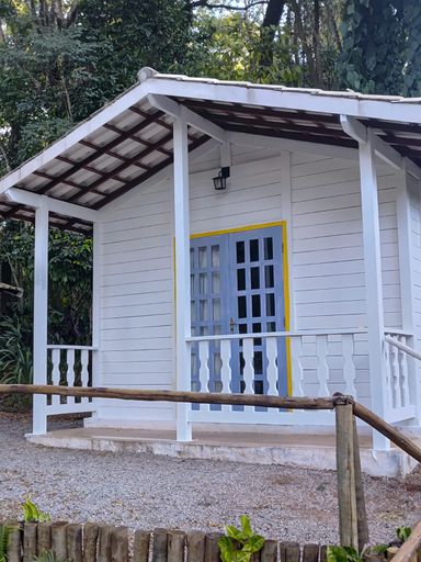 São 06 suítes amplas, chalés de madeira integrados à área de mata, proporcionando privacidade e uma experiência única. As áreas sociais contam com sala de estar e jantar com pé-direito duplo e lareira, criando um ambiente aconchegante e elegante.