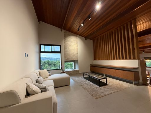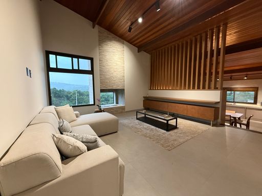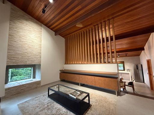 Sala ampla com pé-direito alto, forro em madeira e lareira que traz um toque acolhedor;