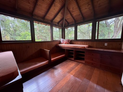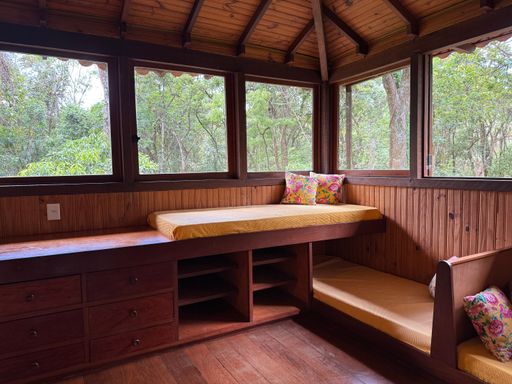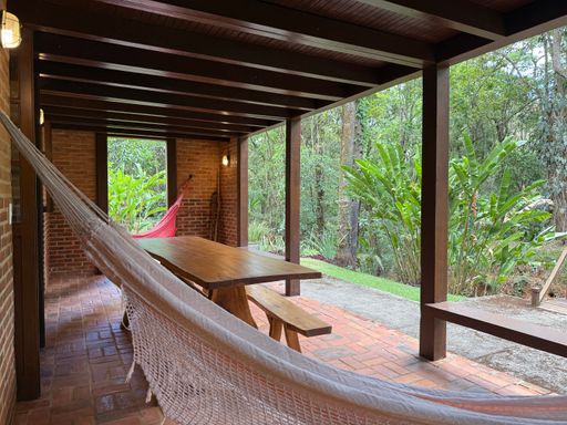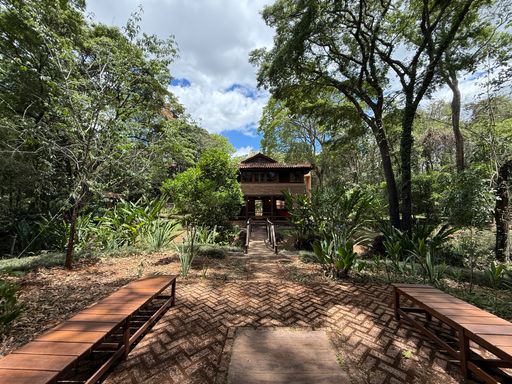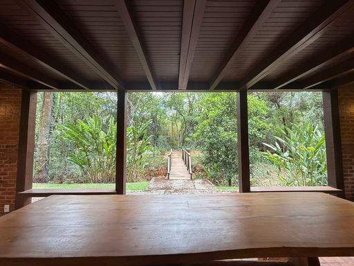 Um dos grandes destaques é a estrutura junto ao riacho, inspirada na arquitetura japonesa, com ambientes envidraçados e vista deslumbrante para a mata — perfeita para relaxar e se reconectar com a natureza.
