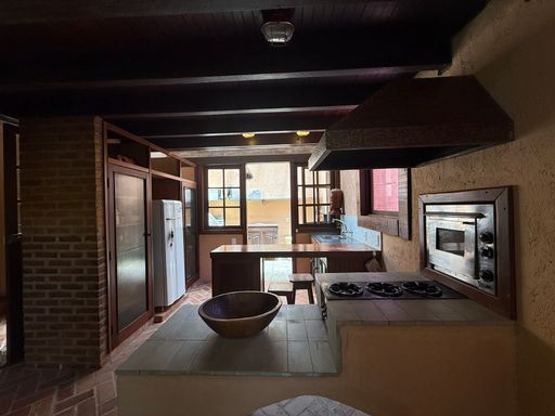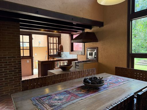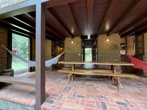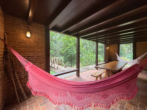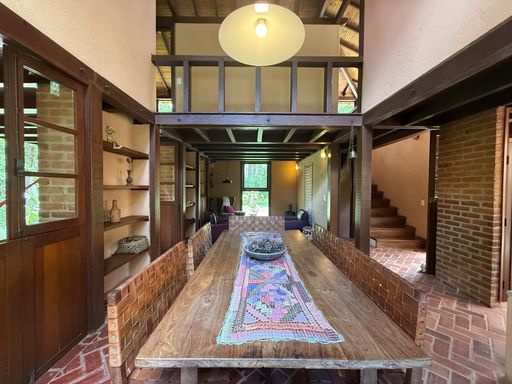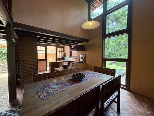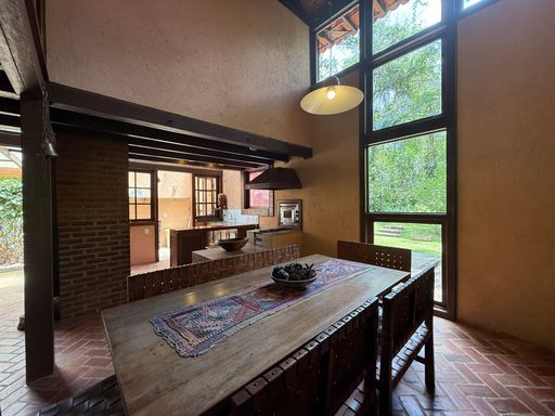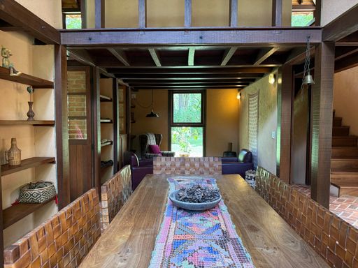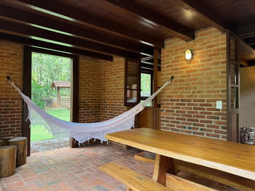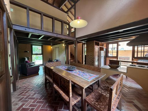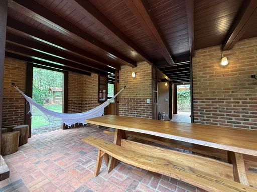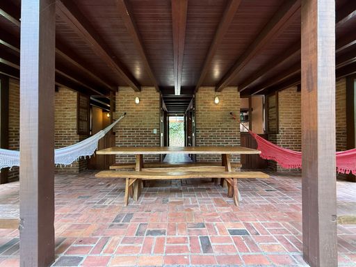 Com arquitetura charmosa em tijolinho ecológico, a casa principal possui varanda aconchegante, jardim planejado e 7 vagas de garagem. O espaço externo é um verdadeiro convite ao bem-estar, com área para luais e fogueiras, criando um ambiente mágico para reunir amigos e familiares sob o céu estrelado.