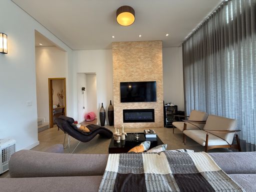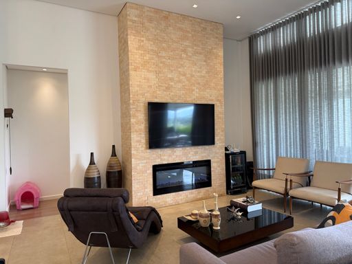 Nos espaços internos, destaque para a lareira elétrica, que traz aconchego e sofisticação em todas as estações.
