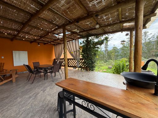 As charmosas varandas com telhado de palha criam aquele clima de casa de campo, perfeito para relaxar e apreciar a vista para as montanhas.