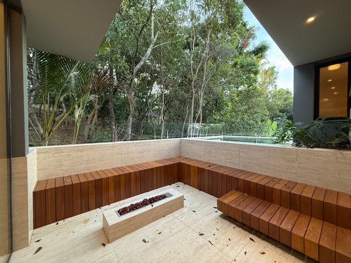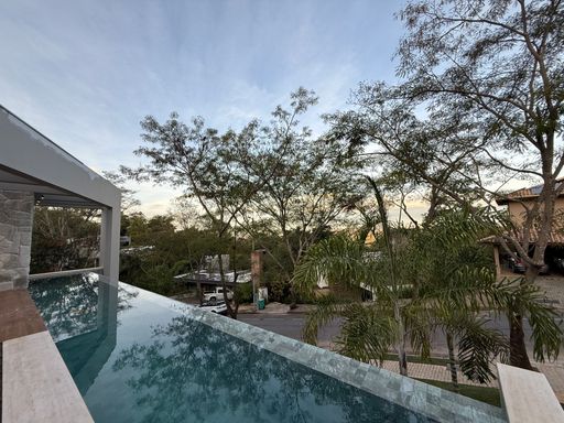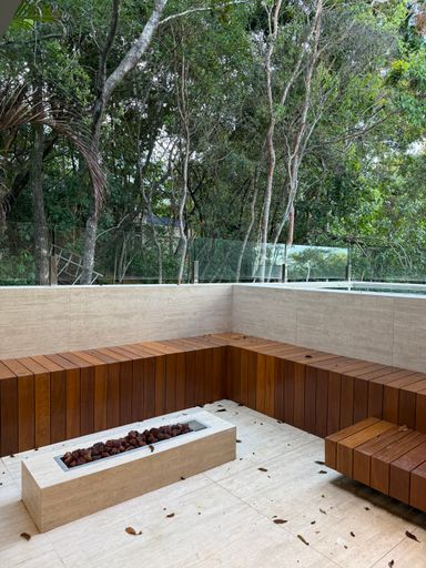 Um dos grandes destaques da casa é a varanda gourmet com fachada em vidro, que valoriza a vista e conecta o interior ao lazer externo. A área conta com churrasqueira e uma belíssima piscina de borda infinita, perfeita para momentos de descanso e entretenimento.