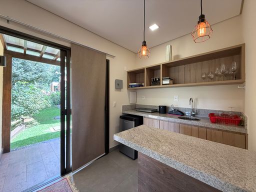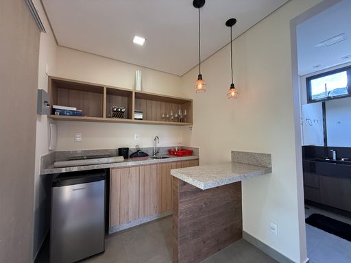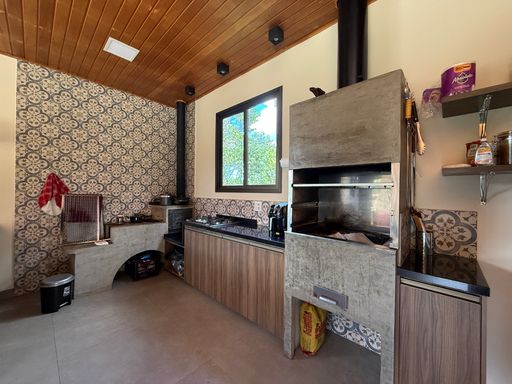 O espaço gourmet é um verdadeiro charme, ideal para quem gosta de receber. Conta com churrasqueira, fogão a lenha e integração com a área externa, criando um ambiente super agradável.
